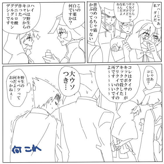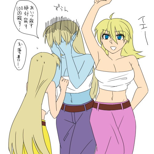 どうしようもないどうしようもないブログですPAGE | 1 2 3 4 | ADMIN | WRITE 2012.03.07 Wed 22:20:02 考えたって仕方がないおしゃかしゃま聴きながら描いたらこうなった。 いやー吸血鬼って本当にいいものですね。 レミたんとか旦那とか婦警とかデミトリとかデミトリとか、あとデミトリとか デミトリなんて可愛い金髪少女にもなれる、一石二鳥。 旦那なんて青年にもオッサンにも幼女にもなれるんだからもう完璧すぎますね。 婦警も可愛いよね、金髪赤目最高。あのあれです、OVAヘルシング見たいんです。 吸血鬼つながりでスレイヤーさんに興味があります。 色んな所に興味が行っているヘェェーイ KOFはアッシュと紫苑さんと無界さんが非常に気になる。アッシュ編?っていうの? XIII体験版で京様がかっこよかったのとテリーにフルボッコされた記憶しかない。 ギルティギアはザトーさんが気になる。うーん雑食。 ジェダ×バレッタについて本気出して考えた結果愉快なことになった。 例のごとく畳みます。ていうか画像がでかいのばっかりです。 PR 2012.03.04 Sun 01:56:24 ありがとうございます無双4の甄姫が好きすぎた結果。 男は露出少ない方が好きなんですけど 女の子の場合は露出してようがしてまいがそんなの関係ねえ私です。 でもあの、胸とか尻とかは出してないのに、脇とかへそとか横腹とか出してる服は 滅びのバーストストリーム並の攻撃力があると思うのは私だけじゃないと思います。 男女構わず言えるのは露出少ない方が剥いた時の妄想が広がると言うことですね。 どうでもいいですね。 三國無双の女性陣では間違いなく甄姫がナンバーワンです。美人可愛い。 男性陣は言うまでもなく曹丕です。夫婦大好き。 OROCHIやったら夫婦の強さが尋常じゃなくて吹いた。 甄姫のビンタ見てると敵うらやましくなるよね。 街亭で伊達をひたすらビンタしたいんだけど 伊達のところに着くころには大体味方にフルボッコされてるのでなかなかあたってくれないです。 頼むから星彩さんと祝融さんせめて馬から降りてください。 戦国1のくのいちが大好きだったんですけど 3でかなり変わっちゃいましたね、あっちもかわいいんだけども でも1のくのいちが見た目性格ともにめっちゃ好きだったのでちょっとしょんぼり。 まあ2に出てないことに比べたら全然いいんだけど 市みたいに劇的ビフォーアフターしてたらどうしよう、いや買わないけど別に。 そういや1のくのいちのストーリーすごい鬱エンドだった気がする。 売っちゃったから見れんけどフーゥ! 戦国だとくのいちか阿国さんかで迷います。 今思ったけど無双の忍ってまともな人半蔵しかいない気がする。 2の蘭丸でアホのようにテンション上がったなあ懐かしい。 コラボ流行ってるから無双VSBASARAとかやってくれないかな。 無双の伊達とBASARAの伊達とかさ…どう考えても無双負けますね。 それ以前にキャラ選択超ややこしくなるから無理ですね。 妄想だけが駆け巡る狂気、すげーいやですね。 今考えるとバレンタインも恵方巻きも逃してるね、アホですね。 デミトリにひたすら無表情で豆ぶつけまくるゼロ子とか浮かんだんですけど 何故今浮かんだのか意味が分かりません。 2012.02.27 Mon 01:56:06 ヘヴン状態ジェダバレ(笑) 塗り残しを現在進行形で見つけたけど 何、気にすることはない。 今に始まったことではないんですけど頭がヘヴン状態です。 あと気が多すぎて目がロンパリ状態です。 でも嫁は安定のゼロ子ですどうもこんばんは。 ヴァンパイアはほんとに魅力のあるキャラが多すぎて困る。 その結果がジェダバレ(笑)です。 なんか普通に仲良かったら可愛いと思うんだ。 レイレイフェリシアバレッタは仲良さそう。 ザべレイ前提で三人で恋バナとかしてる際にどストレートな発言しかしないバレッタとか。 とにかくかっこよければそれでいいんだ。 そしてデミトリとモリガンとジェダは最早トリオ漫才でいい。 突っ込みがジェダしかいないという悲惨さです。 でもモリガンゲーム内だとかなり常識人だよね、ごめん。 SAIFONで遊びまくった結果がコレ↓ 稲中のパロです。絵柄までは無理です、ワロス。 なんかほんとに自分の中でジェダがどんどん可哀相な人になっていくのはなぜだ。 デミトリは元々可哀相だから別に(ryすいませんかっこいいです。 好きなキャラほどひどい扱いにしたくなる病気なので許してください。 でもデミトリかっこいいよね(二回目) ここから女体化とかアーンな話とか駄目な人は回れ右だ。 ちょっとあれなのも混ざってる上にゼロ子しかいない追記 2012.02.18 Sat 01:01:59 さよならを教えて魂と血の返済を求める(切実) 某ブラジャー探す人たちのアレです。 ていうか正直巨乳描きたかっただけです。 ブリス金髪の三人、みんな好きなんですけどどうしよう。 おっぱいさえ描ければそれだけで生きていける気すらしてきたどうもこんばんは。 巨乳好きです、男女問わず。貧乳も好きです、女の子限定で。 いや美乳ならなんでもいい、というか
